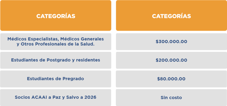 Nos complace darles la bienvenida al III Congreso Colombiano de Errores Innatos de la Inmunidad – CCEII 2026, el cual se llevará a cabo en la ciudad de Cali, Colombia los días 24 y 25  de septiembre de manera presencial. A continuación los invitamos a conocer las tarifas y procedimientos de pago.